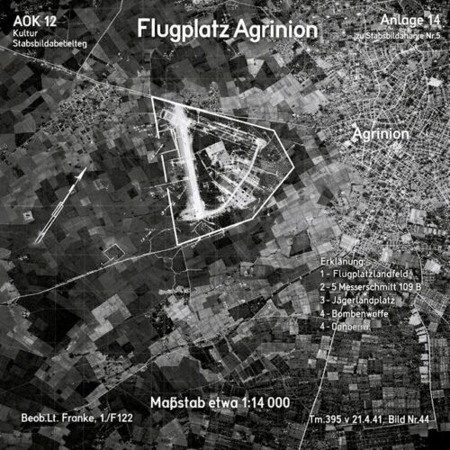 Η αεροφωτογραφία της ανάρτησης δεν είναι απλά και μόνο μια αρχειακή φωτογραφία που σου δίνει τη δυνατότητα να δεις μια περιοχή από ψηλά είναι ένα ντοκουμέντο. Δημοσιεύτηκε στο προφίλ της ομάδας του fb «Η Αεροπορική Ιστορία στην Ελλάδα – Aviation History in Hellas-Greece» και είναι τραβηγμένη από τον Υπολοχαγό Franke, της 1ης Μοίρας/F122, την 21η Απριλίου 1941, δύο μέρες δηλαδή, μετά τον 2ο βομβαρδισμό του Αγρινίου και μια ημέρα μετά την κατάληψη του αεροδρομίου (20 Απριλίου 1944). Τα υπόλοιπα που αναγράφονται πάνω στη φωτογραφία, μεταφράζονται (από αριστερά προς δεξιά και από πάνω προς τα κάτω), όπως παρακάτω: