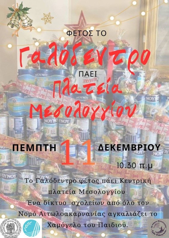Στην καρδιά της Ιερής Πόλης, στην Κεντρική Πλατεία Μεσολογγίου, το φετινό «Γαλόδεντρο» υψώνεται ως σύμβολο προσφοράς και αλληλεγγύης. Την Πέμπτη 11 Δεκεμβρίου 2025, στις 10:30 το πρωί, μαθητές και μαθήτριες από σχολεία όλης της Αιτωλοακαρνανίας θα συγκεντρωθούν για να στολίσουν το πιο ιδιαίτερο δέντρο των Χριστουγέννων: ένα δέντρο φτιαγμένο από κουτιά γάλακτος εβαπορέ, αφιερωμένο στο «Χαμόγελο του Παιδιού».