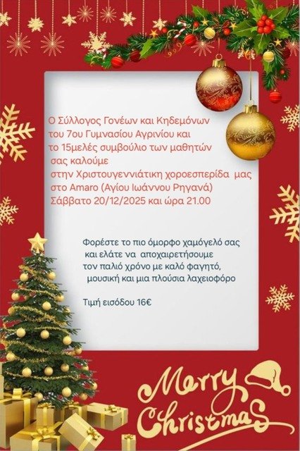 Σε εορταστικούς ρυθμούς κινείται η σχολική κοινότητα του 7ου Γυμνασίου Αγρινίου, η οποία προσκαλεί γονείς, μαθητές και φίλους σε μια χριστουγεννιάτικη χοροεσπερίδα με κοινωνικό και ψυχαγωγικό χαρακτήρα. Ο Σύλλογος Γονέων και Κηδεμόνων, σε συνεργασία με το 15μελές μαθητικό συμβούλιο, διοργανώνει μια βραδιά συνάντησης και διασκέδασης, με στόχο να κλείσει το έτος σε ζεστό, συλλογικό κλίμα.