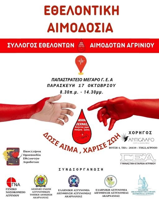Με σύνθημα «Δώσε Αίμα – Χάρισε Ζωή», ο Σύλλογος Εθελοντών Αιμοδοτών Αγρινίου απευθύνει κάλεσμα στους πολίτες να συμμετάσχουν στην εθελοντική αιμοδοσία που θα πραγματοποιηθεί την Παρασκευή 17 Οκτωβρίου, από τις 8:30 το πρωί έως τις 2:30 το μεσημέρι, στο Παπαστράτειο Μέγαρο της Γυμναστικής Εταιρείας Αγρινίου (Γ.Ε.Α), στην Πλατεία Παναγοπούλου.