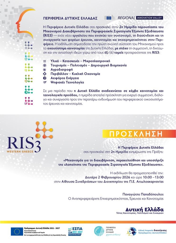 Στην αίθουσα συνεδριάσεων του Διοικητηρίου της Π.Ε. Αιτωλοακαρνανίας, τη Δευτέρα 2 Φεβρουαρίου 2026, η Περιφέρεια Δυτικής Ελλάδας επιχειρεί μια ακόμη θεσμική παρουσίαση. Με τη 2η Ημερίδα του Μηχανισμού Διακυβέρνησης RIS3, ανοίγει δημόσια τη συζήτηση για το πώς η στρατηγική της «Έξυπνης Εξειδίκευσης» παύει να είναι ένα ευρωπαϊκό ακρωνύμιο και μετατρέπεται σε καθημερινό εργαλείο πολιτικής, ανάπτυξης και συνεργασίας.
