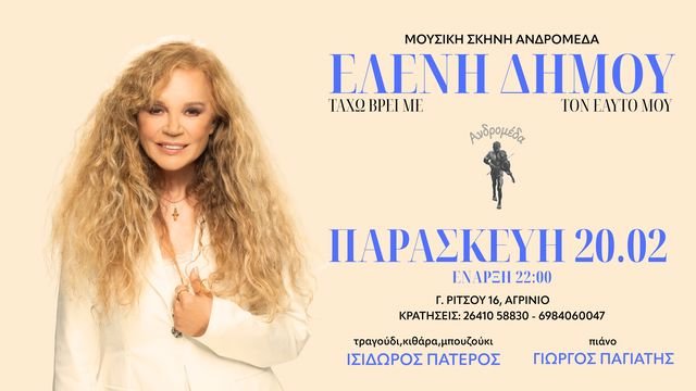 Η Ελένη Δήμου, η οποία συγκαταλέγεται ανάμεσα στις πιο αισθαντικές και διαχρονικά αγαπημένες φωνές της ελληνικής μουσικής σκηνής, έρχεται στη Μουσική Σκηνή Ανδρομέδα την Παρασκευή 20 Φλεβάρη, όπου θα πραγματοποιήσει μια μοναδική εμφάνιση μέσα από την οποία υπόσχεται να μας ταξιδέψει στις πιο μελωδικές και βαθιά συγκινητικές στιγμές της πορείας της, σε μια βραδιά που αναμένεται να ισορροπήσει ανάμεσα στη νοσταλγία και τη ζωντανή ερμηνευτική δύναμη του σήμερα, καθώς θα έχουμε την ευκαιρία να ακούσουμε τραγούδια που σημάδεψαν εποχές και που, ενώ έχουν αγαπηθεί όσο λίγα, εξακολουθούν να συγκινούν με την ίδια ένταση κάθε φορά που ακούγονται ζωντανά.