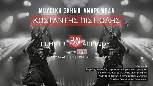 Ο Κωσταντής Πιστιόλης ανεβαίνει στη σκηνή της Μουσικής Σκηνής Ανδρομέδα στο Αγρίνιο, την Πέμπτη 30 Απριλίου, σε μια εμφάνιση που συγκεντρώνει στοιχεία από τη μέχρι τώρα προσωπική του διαδρομή. Το πρόγραμμα κινείται ανάμεσα σε κομμάτια της δισκογραφίας του και σε επιρροές που έχουν διαμορφώσει το ιδιαίτερο μουσικό του στίγμα.
