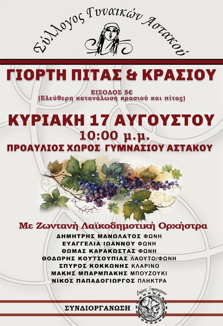 Ο Αστακός ετοιμάζεται να πλημμυρίσει αρώματα, γεύσεις και μουσικές στην καθιερωμένη πλέον Γιορτή Πίτας και Κρασιού, που διοργανώνει ο Πολιτιστικός Λαογραφικός Σύλλογος Γυναικών Αστακού. Η εκδήλωση θα πραγματοποιηθεί την Κυριακή 17 Αυγούστου 2025, στις 10:00 το βράδυ, στον προαύλιο χώρο του Γυμνασίου Αστακού, μετατρέποντας το σημείο σε ένα μεγάλο υπαίθριο γλέντι.