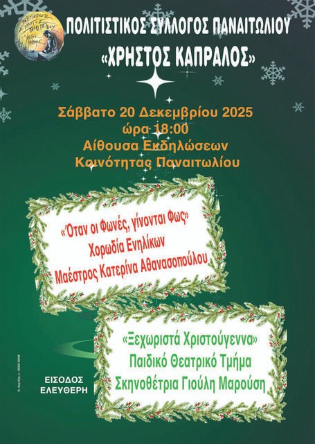 Με μια εκδήλωση αφιερωμένη στο πνεύμα των «Ξεχωριστών Χριστουγέννων», ο Πολιτιστικός Σύλλογος Παναιτωλίου «Χρήστος Καπράλος» προσκαλεί το κοινό σε μια βραδιά όπου η μουσική και το θέατρο συναντιούνται και μετατρέπουν τη σκηνή σε χώρο συγκίνησης και φωτός. Ο τίτλος της εκδήλωσης, «Όταν οι φωνές γίνονται φως», συνοψίζει το καλλιτεχνικό και συμβολικό της περιεχόμενο, αναδεικνύοντας τη δύναμη της συλλογικής έκφρασης μέσα από τη φωνή και την παρουσία των παιδιών και των ενηλίκων.