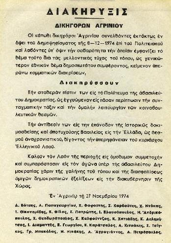 «Οι κάτωθι δικηγόροι Αγρινίου, συνελθόντες εκτάκτως εν όψει του Δημοψηφίσματος της 8ης Δεκεμβρίου 1974 επί του Πολιτειακού και λαβόντες υπ’ όψιν τη σοβαρότητα την οποίαν εμφανίζει το θέμα τούτο για τις μελλοντικές τύχες του τόπου, ως γενικότερον εθνικό θέμα δημοσιωτάτου συμφέροντος, κείμενον υπεράνω κομματικών διακρίσεων,