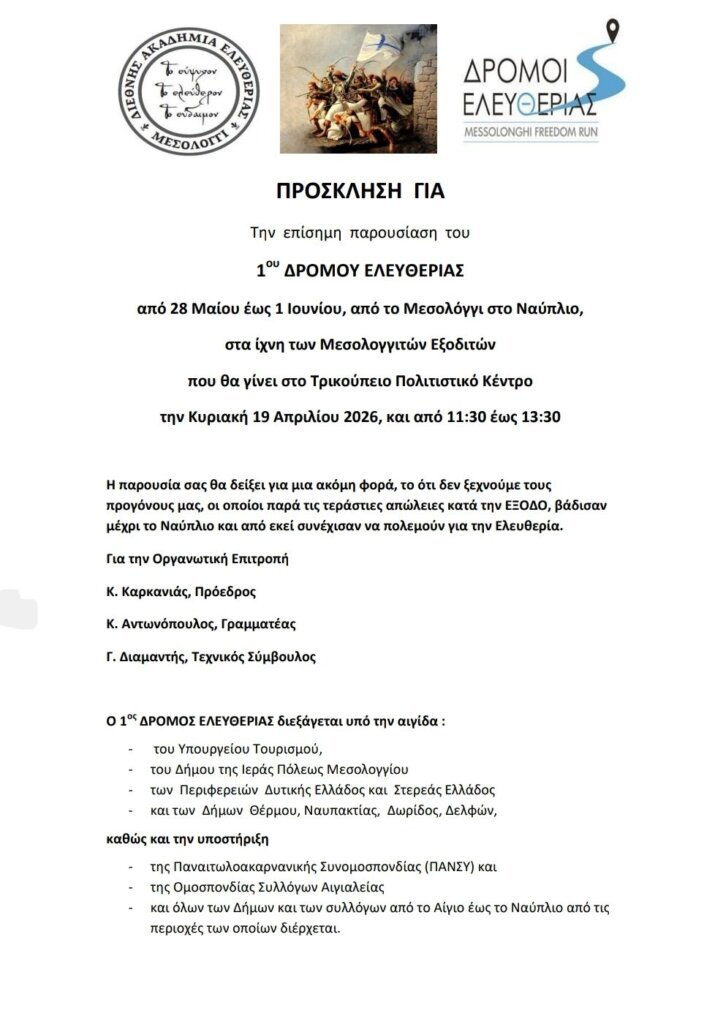 Η επίσημη παρουσίαση της διοργάνωσης θα πραγματοποιηθεί την Κυριακή 19 Απριλίου 2026, από τις 11:30 π.μ. έως τις 1:30 μ.μ., στο Τρικούπειο Πολιτιστικό Κέντρο Μεσολογγίου. Πρόκειται για μια εκδήλωση που φιλοδοξεί να αναδείξει το ιστορικό και συμβολικό φορτίο της ίδιας της διαδρομής.