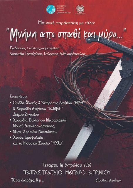 Ο Δήμος Αγρινίου και το Τμήμα Παραδοσιακής Μουσικής της Διεύθυνσης Πολιτισμού του Δήμου Αγρινίου σε συνεργασία με την Περιφέρεια Δυτικής Ελλάδας συνδιοργανώνουν τη μουσική παράσταση με τίτλο «Μνήμη από σπαθί και μύρο…», η οποία θα πραγματοποιηθεί την Τετάρτη 1η Απριλίου 2026 και ώρα 8μμ στο Παπαστράτειο Μέγαρο Αγρινίου, με ελεύθερη είσοδο.