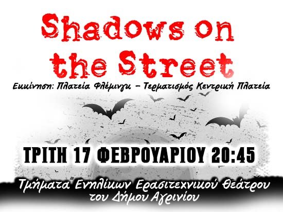 Την Τρίτη 17 Φεβρουαρίου 2026, στις 8.45 μ.μ., τα Τμήματα Ενηλίκων του Ερασιτεχνικού Θεάτρου του Δήμου Αγρινίου καλούν το κοινό σε μια εμπειρία που, καθώς εκτυλίσσεται στον πυρήνα της πόλης, επιχειρεί να μετασχηματίσει τον γνώριμο αστικό ιστό σε σκηνικό μιας ζωντανής, εικαστικής και δραματουργικής σύνθεσης με τίτλο «Shadows on the Street», η οποία φιλοδοξεί να συνδέσει το επιμέρους με το συνολικό, το άτομο με τη συλλογική εμπειρία, το βλέμμα του περαστικού με τη συνειδητή συμμετοχή του θεατή.
