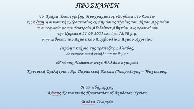 Με στόχο την έγκυρη ενημέρωση και την ενίσχυση της ευαισθητοποίησης γύρω από τη νόσο Alzheimer, το Τμήμα Υποστήριξης του Προγράμματος «Βοήθεια στο Σπίτι» της Διεύθυνσης Κοινωνικής Προστασίας και Δημόσιας Υγείας του Δήμου Αγρινίου, σε συνεργασία με την Εταιρεία Alzheimer Αθηνών, διοργανώνει ειδική εκδήλωση την Κυριακή 21 Σεπτεμβρίου 2025, στην αίθουσα του Δημοτικού Συμβουλίου (πρώην Τράπεζα της Ελλάδας).