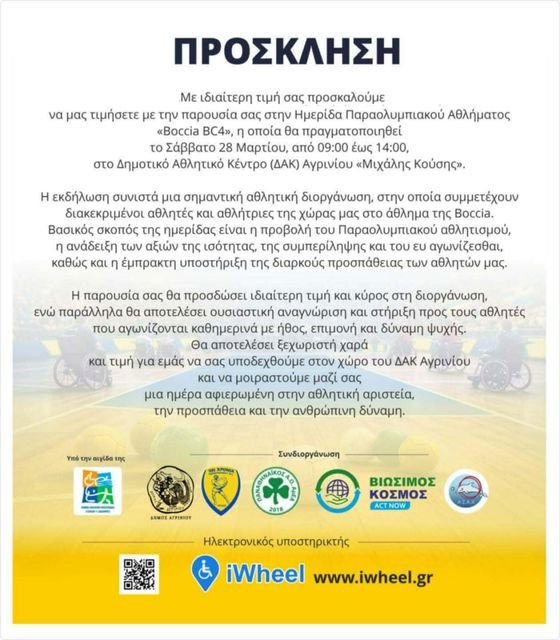 Μια ξεχωριστή ημερίδα αφιερωμένη στο Παραολυμπιακό άθλημα «Boccia BC4», η οποία πρόκειται να πραγματοποιηθεί το Σάββατο 28 Μαρτίου, κατά τις ώρες από 9:00 π.μ. έως 2:00 μ.μ., στον χώρο του Δημοτικού Αθλητικού Κέντρου Αγρινίου «Μιχάλης Κούσης». Θα παραβρεθούν διακεκριμένοι αθλητές και αθλήτριες από όλη τη χώρα που συμμετέχουν ενεργά και διακρίνονται στο συγκεκριμένο άθλημα, το οποίο αποτελεί ένα από τα πλέον δυναμικά και εμπνευσμένα παραδείγματα του Παραολυμπιακού κινήματος. Με τη διεξαγωγή της ημερίδας επιδιώκεται να αναδειχθεί όχι μόνο η αγωνιστική διάσταση της Boccia αλλά και οι βαθύτερες αξίες που αυτή πρεσβεύει, καθώς προβάλλεται η ισότητα των ευκαιριών, ενισχύεται η έννοια της συμπερίληψης και προάγεται το ιδεώδες του ευ αγωνίζεσθαι, το οποίο συνδέεται άρρηκτα με τον σεβασμό, την προσπάθεια και την αξιοπρέπεια, στοιχεία που χαρακτηρίζουν τους αθλητές.