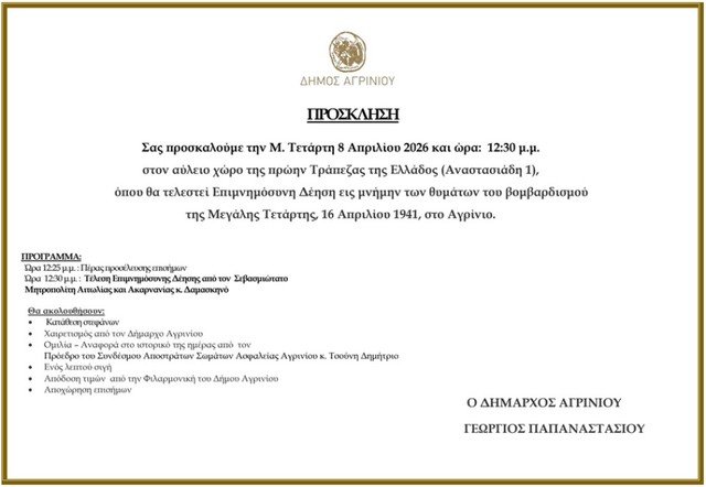 Ο Δήμος Αγρινίου προχωρά σε μια σεμνή εκδήλωση μνήμης, η οποία διοργανώνεται ώστε να τιμηθούν τα θύματα του βομβαρδισμού της πόλης κατά τη διάρκεια του Β’ Παγκοσμίου Πολέμου, ενώ παράλληλα επιδιώκεται να διατηρηθεί ζωντανή η ιστορική συνείδηση των πολιτών, καθώς η επιμνημόσυνη δέηση πρόκειται να τελεστεί τη Μεγάλη Τετάρτη 8 Απριλίου 2026 και ώρα 12:30 μ.μ., στον αύλειο χώρο της πρώην Τράπεζας της Ελλάδος.