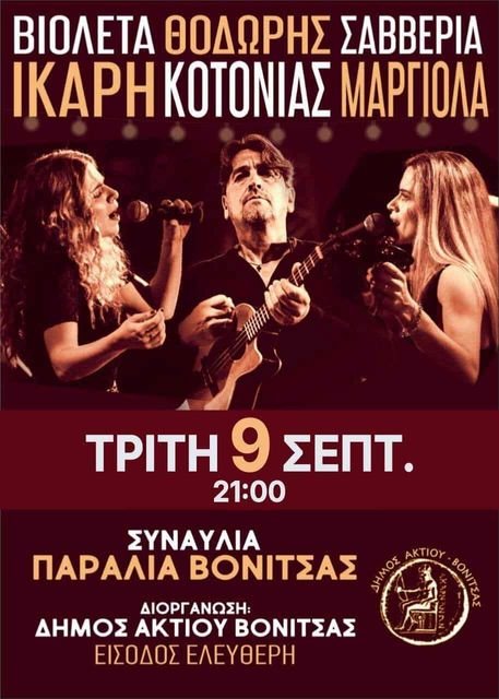 Ο δήμος Ακτίου – Βόνιτσας διοργανώνει μια μεγάλη συναυλία για να αποχαιρετήσει το καλοκαίρι, χαρίζοντας στους δημότες και τους επισκέπτες μια βραδιά γεμάτη ρυθμό και συναίσθημα. Στη σκηνή θα ανέβουν τρεις καλλιτέχνες με ξεχωριστή πορεία και φανατικό κοινό: η Βιολέτα Ίκαρη, ο Θοδωρής Κοτονιάς και η δική μας Σαββέρια Μαργιολά.