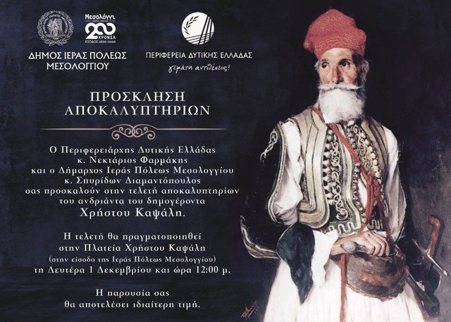 Η τελετή θα πραγματοποιηθεί τη Δευτέρα 1 Δεκεμβρίου 2025, στις 12:00 το μεσημέρι, στο πλαίσιο των εκδηλώσεων προετοιμασίας για τη Διακοσιοστή Επέτειο της Εξόδου. Τα αποκαλυπτήρια θα κάνουν ο Δήμαρχος Ιεράς Πόλεως Μεσολογγίου κ. Σπυρίδων Διαμαντόπουλος και ο Περιφερειάρχης Δυτικής Ελλάδας, Νεκτάριος Φαρμάκης, ενώ θα παραστεί και θα τελέσει επιμνημόσυνη δέηση ο Σεβασμιώτατος Μητροπολίτης Αιτωλίας και Ακαρνανίας κ.κ. Δαμασκηνός.