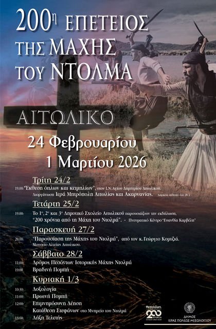 Με αφορμή τη συμπλήρωση διακοσίων ετών από τη Μάχη του Ντολμά, ο Δήμος Ιεράς Πόλεως Μεσολογγίου προχωρά στη διοργάνωση μιας σειράς επετειακών εκδηλώσεων, οι οποίες θα πραγματοποιηθούν από τις 24 Φεβρουαρίου έως και την 1η Μαρτίου 2026, μέσα από ένα πολυήμερο πρόγραμμα αφιερωμένο στη μνήμη των αγωνιστών, ενώ παράλληλα επιχειρείται η ανάδειξη της ιστορικής σημασίας της σύγκρουσης που σημάδεψε την περιοχή και εντάσσεται στο ευρύτερο πλαίσιο της Ελληνικής Επανάστασης.