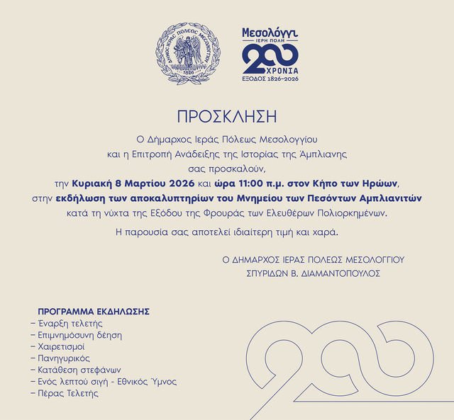 Η Ιερή Πόλη του Μεσολογγίου ετοιμάζεται να ζήσει μια ακόμη στιγμή έντονης ιστορικής μνήμης, σε μια περίοδο κατά την οποία συμπληρώνονται δύο αιώνες από την ηρωική Έξοδο των Ελευθέρων Πολιορκημένων, καθώς μέσα σε αυτό το φορτισμένο επετειακό πλαίσιο οργανώνεται τελετή αποκαλυπτηρίων ενός νέου μνημείου που θα προστεθεί στον ιστορικό χώρο του Κήπου των Ηρώων και το οποίο είναι αφιερωμένο στους αγωνιστές από την Άμπλιανη της Φθιώτιδας που θυσιάστηκαν κατά τη δραματική νύχτα της Εξόδου, συμβάλλοντας με την αυτοθυσία τους σε ένα από τα πιο εμβληματικά γεγονότα της Ελληνικής Επανάστασης.
