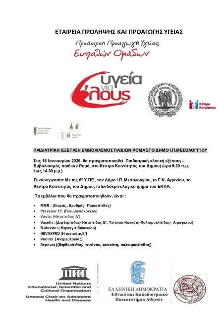 Σε μια οργανωμένη πρωτοβουλία πρόληψης και φροντίδας της παιδικής υγείας, ο Δήμος Ιερής Πόλης Μεσολογγίου, μέσω του Κέντρου Κοινότητάς του, ανακοινώνει τη διεξαγωγή παιδιατρικής κλινικής εξέτασης και εμβολιασμού παιδιών Ρομά.