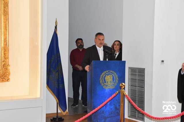 Και καθώς η βραδιά προχωρούσε ξεχώρισε η στιγμή που ο Δήμαρχος Ιεράς Πόλεως Μεσολογγίου, Σπύρος Β. Διαμαντόπουλος στάθηκε απέναντι στο ίδιο το έργο σαν να απευθυνόταν σε μια ζωντανή παρουσία, καλωσορίζοντάς το, εκεί όπου ανήκει πραγματικά, μιλώντας όχι με τυπικό λόγο αλλά με έναν τόνο άμεσο ανθρώπινο σχεδόν εξομολογητικό που δεν περιέγραφε απλώς την επιστροφή ενός πίνακα αλλά την επανένωση ενός κομματιού της ψυχής της πόλης με τον τόπο του, αναδεικνύοντας πως αυτό που επέστρεψε δεν ήταν εικόνα αλλά μνήμη δεν ήταν χρώμα αλλά ιστορία δεν ήταν τέχνη αλλά ταυτότητα.