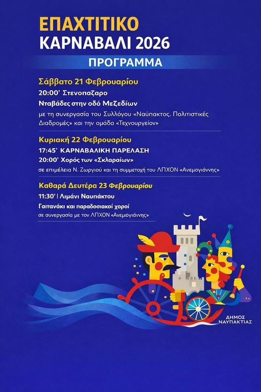 Το Επαχτίτικο Καρναβάλι 2026 έρχεται στη Ναύπακτο σαν μια μεγάλη αφήγηση που ξεκινά ήσυχα ένα πρωινό Σαββάτου, απλώνεται μέρα με τη μέρα σε πλατείες, στενά και λιμάνια και κορυφώνεται την Καθαρά Δευτέρα, εκεί όπου η πόλη συναντιέται ξανά με τον εαυτό της, με τον Δήμο Ναυπακτίας και τον Σύλλογο «Ναύπακτος. Πολιτιστικές Διαδρομές» να καλούν μικρούς και μεγάλους σε ένα αποκριάτικο ταξίδι που μπλέκει την παράδοση με το παιχνίδι, τη δημιουργικότητα με το κέφι, τη συλλογική μνήμη με τη χαρά της συμμετοχής, μέσα από εκδηλώσεις που απλώνονται σε διαφορετικά σημεία της πόλης και δίνουν τον ρυθμό της Αποκριάς σε μια Ναύπακτο γεμάτη χρώμα, κίνηση και χαμόγελα