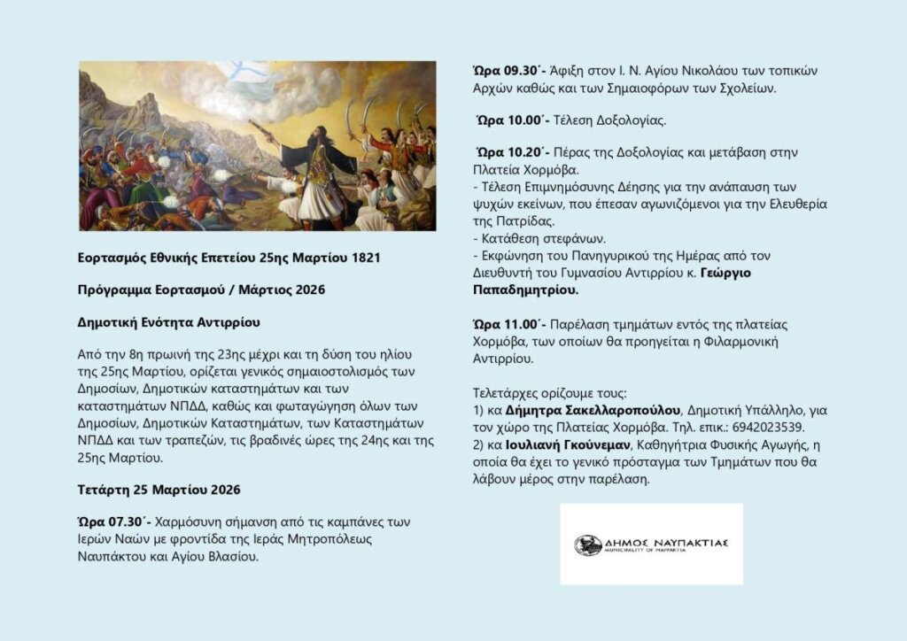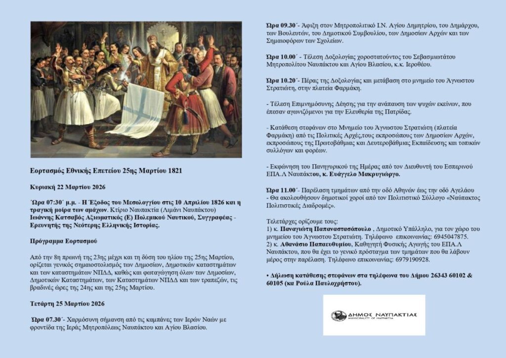 Με ένα πλούσιο πρόγραμμα εκδηλώσεων, ο Δήμος Ναυπακτίας τιμά την εθνική επέτειο της 25ης Μαρτίου, όπως ανακοίνωσε σε επίσημο δελτίο του, δίνοντας τον τόνο σε Ναύπακτο και Αντίρριο. Από τον γενικό σημαιοστολισμό και τον φωταγωγημένο εορτασμό έως τις δοξολογίες, τις καταθέσεις στεφάνων και τις μαθητικές παρελάσεις, η περιοχή μπαίνει σε εορταστικό κλίμα. Οι εκδηλώσεις κορυφώνονται ανήμερα της επετείου, με τη συμμετοχή αρχών, σχολείων και πολιτιστικών συλλόγων, ενώ το πρόγραμμα περιλαμβάνει και επετειακή ομιλία για την Έξοδο του Μεσολογγίου, ενισχύοντας τον ιστορικό χαρακτήρα των ημερών.