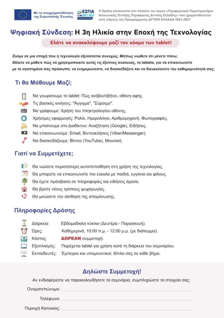 Ο Δήμος Ξηρομέρου ανοίγει νέους δρόμους για τους δημότες του, φέρνοντας την τεχνολογία πιο κοντά στην καθημερινότητα των ανθρώπων της τρίτης ηλικίας. Στο πλαίσιο της ενίσχυσης των ψηφιακών δεξιοτήτων, προχωρά στην υλοποίηση δράσης εκμάθησης και ενδυνάμωσης της χρήσης ηλεκτρονικών υπολογιστών, με στόχο να δώσει στους μεγαλύτερους συμπολίτες τα εργαλεία για μια πιο ενεργή, ανεξάρτητη και συνδεδεμένη ζωή.
