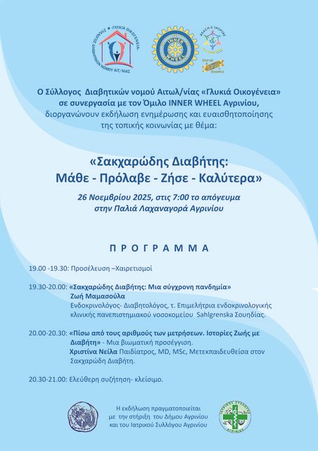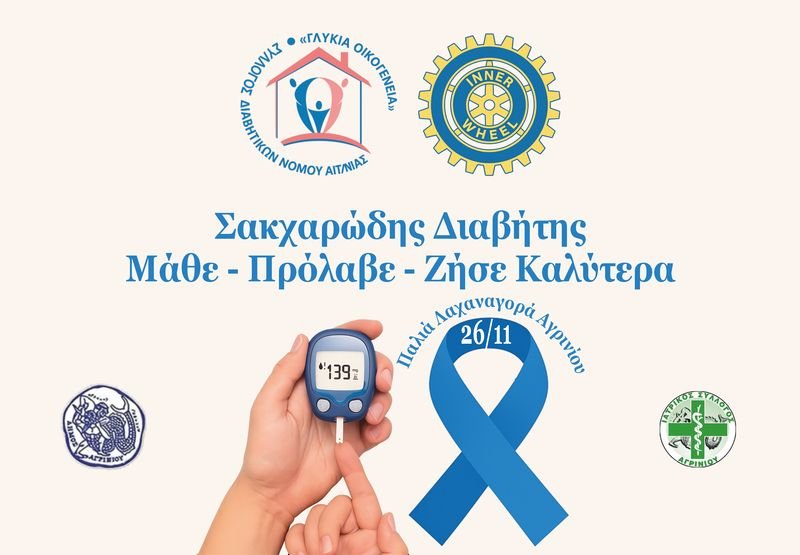 Με στόχο την ενημέρωση, την πρόληψη και τη στήριξη των ανθρώπων που ζουν με σακχαρώδη διαβήτη, ο Σύλλογος Διαβητικών Νομού Αιτωλοακαρνανίας “Γλυκιά Οικογένεια” και ο Όμιλος INNER WHEEL Αγρινίου ενώνουν δυνάμεις και διοργανώνουν μια εκδήλωση ενημέρωσης και ευαισθητοποίησης με θέμα: