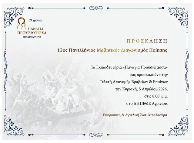 Με τη συμμετοχή μαθητών από σχολεία όλης της Ελλάδας αλλά και του εξωτερικού, κορυφώνεται την Κυριακή 5 Απριλίου στις 8:00 μ.μ. η φετινή διοργάνωση του 13ου Πανελλήνιου Μαθητικού Διαγωνισμού Ποίησης «Ελεύθεροι Πολιορκημένοι», που υλοποιούν τα Εκπαιδευτήρια Παναγία Προυσιώτισσα, με την τελετή απονομής βραβείων και επαίνων.