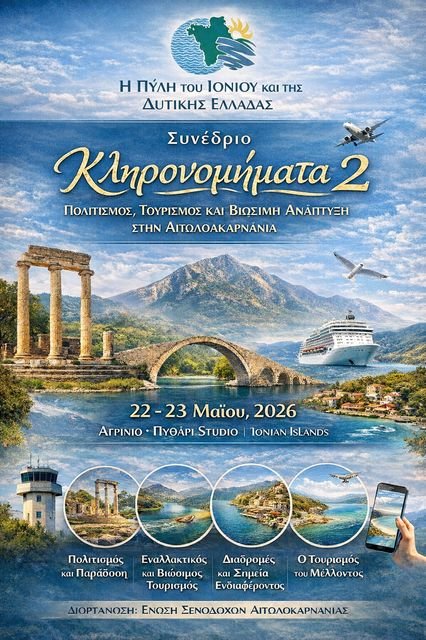Στρατηγική Προοπτική: Η Αιτωλοακαρνανία ως Πύλη του Ιονίου και της Δυτικής Ελλάδας Η Αιτωλοακαρνανία, ένας τόπος με βαθιές ιστορικές ρίζες, σπάνια φυσική ομορφιά και έντονη πολιτισμική ταυτότητα, βρίσκεται στο επίκεντρο ενός σημαντικού διαλόγου για το μέλλον της περιοχής. Η Ένωση Ξενοδόχων Αιτωλοακαρνανίας διοργανώνει το συνέδριο «Κληρονομήματα 2», το οποίο θα πραγματοποιηθεί την Παρασκευή 22 και το Σάββατο 23 Μαΐου 2026 στο Αγρίνιο, στον χώρο Πυθάρι Studio.