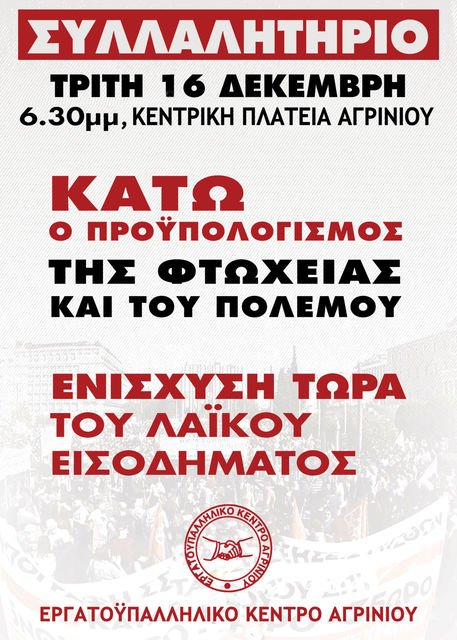 | Το Εργατικό Κέντρο Αγρινίου καλεί σε κινητοποίηση την Τρίτη 16 Δεκεμβρίου