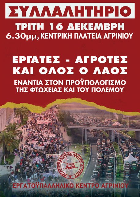 Σε συλλαλητήριο ενάντια στον κρατικό προϋπολογισμό του 2026 καλεί το Εργατικό Κέντρο Αγρινίου, απευθύνοντας κάλεσμα σε εργαζόμενους, ανέργους και λαϊκά στρώματα της περιοχής. Η κινητοποίηση έχει προγραμματιστεί για την Τρίτη 16 Δεκεμβρίου, στις 6:30 το απόγευμα, στην κεντρική πλατεία της πόλης.