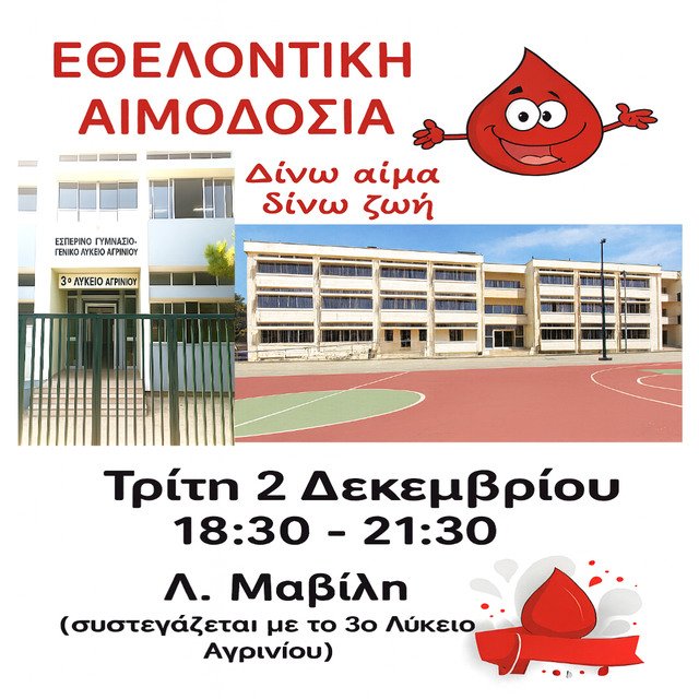 Σε μια περίοδο όπου η ανάγκη για αίμα παραμένει σταθερά υψηλή, το Εσπερινό Γυμνάσιο – Γενικό Λύκειο Αγρινίου καλεί την εκπαιδευτική κοινότητα και τους πολίτες σε μια σημαντική δράση αλληλεγγύης. Την Τρίτη 2 Δεκεμβρίου, από τις 18:30 έως τις 21:30, διοργανώνεται εθελοντική αιμοδοσία στον νέο χώρο του σχολείου, στη Λορέντζου Μαβίλη, όπου πλέον συστεγάζεται με το 3ο Λύκειο.