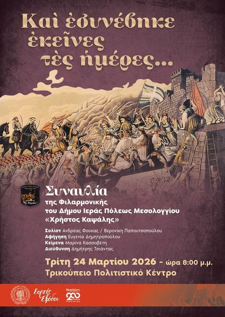 Την Τρίτη 24 Μαρτίου στις 8:00 μ.μ. το Τρικούπειο Πολιτιστικό Κέντρο ανοίγει τις πόρτες του σε μια μουσική συνάντηση που φέρει τον τίτλο «Και εσυνέβηκε εκείνες τες ημέρες…» και αναδεικνύει τη δυναμική παρουσία της Φιλαρμονικής του Δήμου Ιεράς Πόλεως Μεσολογγίου «Χρήστος Καψάλης» μέσα από μια αφήγηση που διαπλέκει τη μουσική με τον λόγο και δημιουργεί ένα ενιαίο καλλιτεχνικό σύνολο που αναπτύσσεται με ρυθμό και ένταση καθώς οι ήχοι συνομιλούν με τα κείμενα και η σκηνική παρουσία μετατρέπεται σε βιωματική εμπειρία για το κοινό.