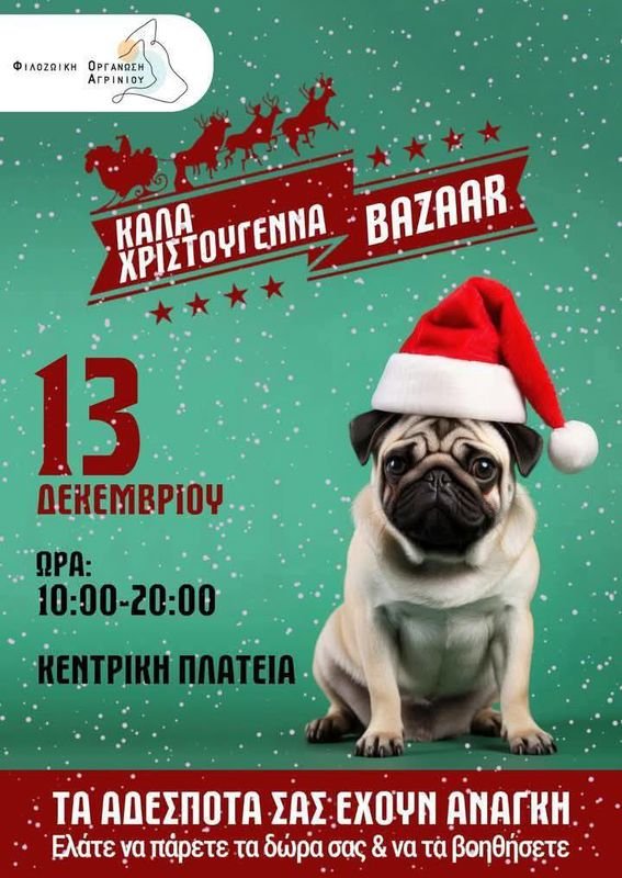 Η Φιλοζωική Οργάνωση Αγρινίου, «επιστρατεύοντας» έναν γλυκύτατο τετράποδο πρωταγωνιστή, απευθύνει ανοιχτό κάλεσμα στους πολίτες να στηρίξουν το έργο της μέσα από το χριστουγεννιάτικο bazaar που διοργανώνει στο κέντρο της πόλης. Αύριο, Σάββατο 13 Δεκεμβρίου, η καρδιά του Αγρινίου θα χτυπά στην κεντρική πλατεία, όπου από νωρίς το πρωί έως το βράδυ θα απλωθούν γιορτινά αντικείμενα, δώρα και μικρές εκπλήξεις με έναν κοινό σκοπό: τη βοήθεια στα αδέσποτα ζώα.