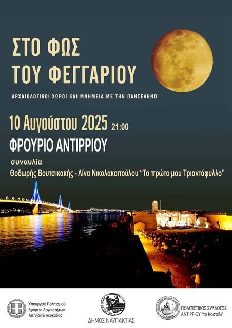 Η βραδιά συνδιοργανώνεται από την Εφορεία Αρχαιοτήτων Αιτωλοακαρνανίας και Λευκάδος και τον Πολιτιστικό Σύλλογο Αντιρρίου «Το Καστέλι», στο πλαίσιο των καθιερωμένων εκδηλώσεων του Υπουργείου Πολιτισμού για την Πανσέληνο του Αυγούστου, που εδώ και χρόνια δίνουν ζωή στα μνημεία και τους αρχαιολογικούς χώρους της χώρας μέσα από τη μουσική και τον πολιτισμό.