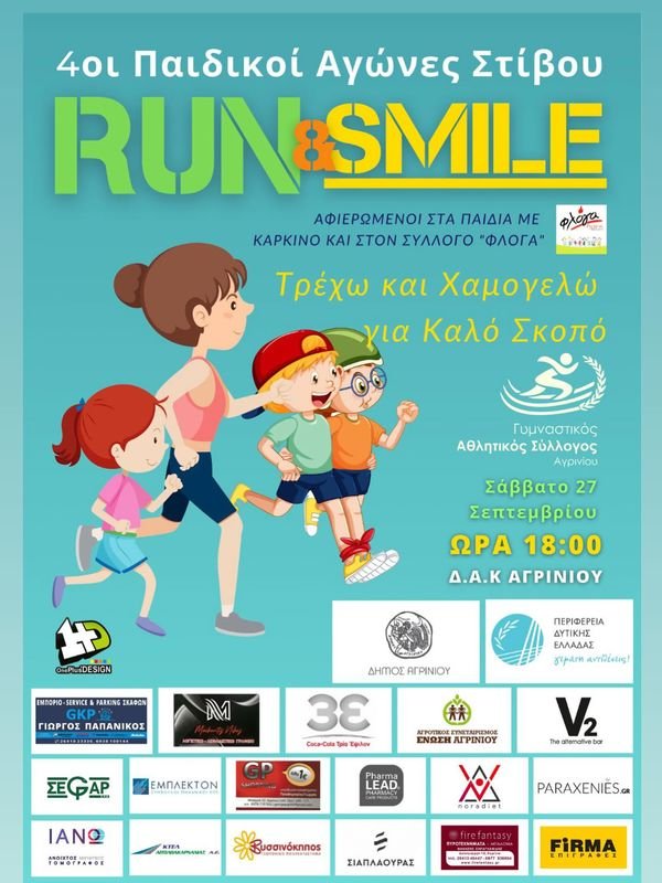 Το Αγρίνιο ετοιμάζεται να γεμίσει χαμόγελα και αθλητική ενέργεια το Σάββατο 27 Σεπτεμβρίου 2025. Ο Γυμναστικός Αθλητικός Σύλλογος Αγρινίου, σε συνεργασία με την Περιφέρεια Δυτικής Ελλάδας και τον Δήμο Αγρινίου, διοργανώνει τους 4ους Παιδικούς Αγώνες Στίβου «Run and Smile» με το σύνθημα «Τρέχω για καλό σκοπό».