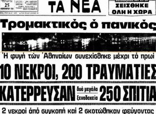 1981 – Ο Εγκέλαδος χτυπά τις Αλκυονίδες με 6,6 Ρίχτερ, αφήνοντας πίσω του 14 θύματα και τους Αθηναίους να περνούν αρκετά βράδια στα πάρκα και τις πλατείες της πόλης. Ήταν 22:59, όσοι δεν κοιμόντουσαν ήταν καθηλωμένοι μπροστά από την τηλεόραση και παρακολουθούσαν από την Κρατική Τηλεόραση το σίριαλ «Το Φως του Αυγερινού».