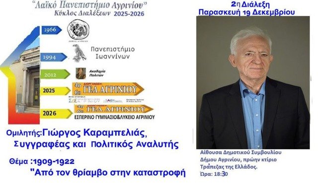 Στο επίκεντρο της δημόσιας συζήτησης φέρνει την ελληνική ιστορία του πρώτου τετάρτου του 20ού αιώνα το «Λαϊκό Πανεπιστήμιο», η σειρά διαλέξεων που συνδιοργανώνουν το 4ο ΓΕΛ Αγρινίου, το 6ο ΓΕΛ Αγρινίου και το Εσπερινό Γυμνάσιο–Λύκειο Αγρινίου. Δεύτερος προσκεκλημένος της πρωτοβουλίας είναι ο συγγραφέας και πολιτικός αναλυτής Γιώργος Καραμπελιάς, μια από τις πλέον αναγνωρίσιμες φωνές του σύγχρονου ελληνικού πολιτικού και ιστορικού προβληματισμού.