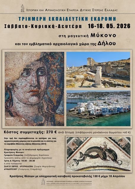 Μια οργανωμένη ευκαιρία γνωριμίας με δύο από τους σημαντικότερους προορισμούς του Αιγαίου προσφέρει η Ιστορική και Αρχαιολογική Εταιρεία Δυτικής Στερεάς Ελλάδας, με έδρα το Αγρίνιο, μέσα από την τριήμερη εκπαιδευτική εκδρομή που διοργανώνει στη Μύκονο και τη Δήλο, από το Σάββατο 16 έως και τη Δευτέρα 18 Μαΐου 2026.