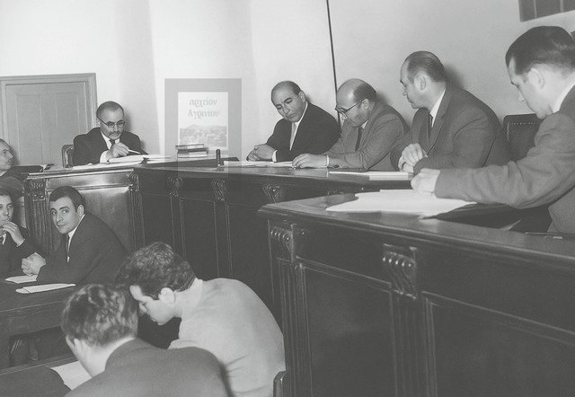 (στο μέσον τους), ο πρόεδρος του δικαστηρίου Σταύρος Ντάλλας και δεξιά, ο Γραμματέας Δημήτρης Τσούνης.