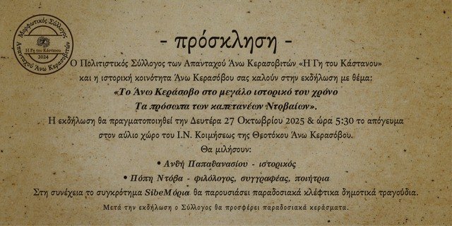 Το Άνω Κεράσοβο επιστρέφει στις ρίζες του και ξανασυναντά την ιστορία του μέσα από μια εκδήλωση-φόρο τιμής στους ανθρώπους που σφράγισαν την τοπική και εθνική του πορεία. Τη Δευτέρα 27 Οκτωβρίου, στις 17:30 το απόγευμα, ο Σύλλογος των Απανταχού Άνω Κερασοβιτών «Η Γη του Κάστανου», σε συνεργασία με την Ιστορική Τοπική Κοινότητα Άνω Κεράσοβου, διοργανώνει μια ιστορική ομιλία με θέμα «Το Άνω Κεράσοβο στον μεγάλο ιστορικό του χρόνο – Τα πρόσωπα των καπεταναίων Ντοβαίων».