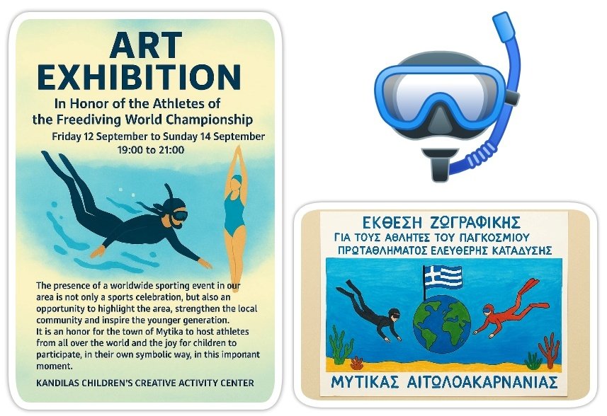 Με χρώματα, πινέλα και έμπνευση από τη θάλασσα, τα παιδιά του ΚΔΑΠ Κανδήλας έστησαν μια μοναδική έκθεση ζωγραφικής αφιερωμένη στους αθλητές του Παγκόσμιου Πρωταθλήματος Ελεύθερης Κατάδυσης που φιλοξενείται αυτές τις ημέρες στον Μύτικα Αιτωλοακαρνανίας.