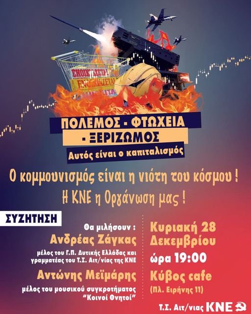 Με αιχμή τα μεγάλα αδιέξοδα της εποχής —τον πόλεμο, τη φτώχεια και τον ξεριζωμό— η Τομεακή Οργάνωση Αιτωλοακαρνανίας της ΚΝΕ ανοίγει τη συζήτηση στο Αγρίνιο, θέτοντας στο επίκεντρο την καπιταλιστική πραγματικότητα και την κομμουνιστική προοπτική. Την Κυριακή 28 Δεκέμβρη, νέοι και νέες καλούνται σε μια ανοιχτή εκδήλωση – συζήτηση με σαφή πολιτικό χαρακτήρα, στο «Κύβος cafe», στην πλατεία Ειρήνης.
