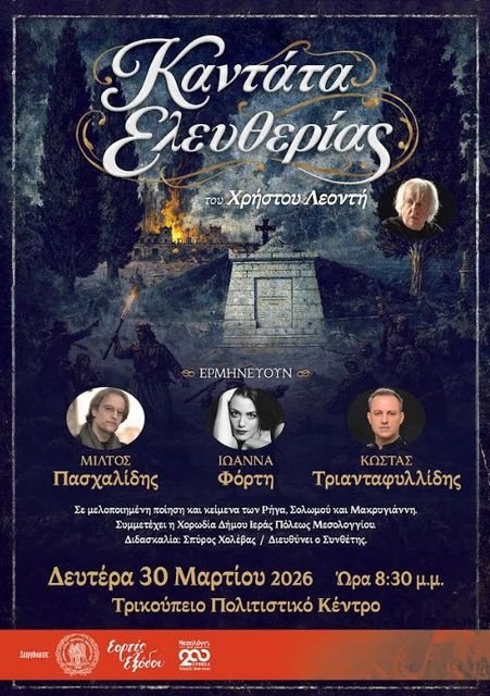 Στο πλαίσιο του εορτασμού για τη Διακοσιοστή Επέτειο από την Ηρωική Έξοδο των Ελευθέρων Πολιορκημένων, ο Δήμος Ιερής Πόλης Μεσολογγίου έχει την τιμή να φιλοξενήσει μια κορυφαία καλλιτεχνική στιγμή. Τη Δευτέρα, 30 Μαρτίου 2026 και ώρα 8:30 μ.μ., το Τρικούπειο Πολιτιστικό Κέντρο θα αποτελέσει το σκηνικό για την παρουσίαση της «Καντάτας Ελευθερίας» του σπουδαίου συνθέτη Χρήστου Λεοντή.