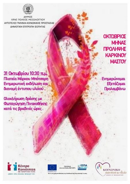 Η καρδιά του Μεσολογγίου «ντύνεται στα ροζ» την Παρασκευή 31 Οκτωβρίου, καθώς το Αυτοτελές Τμήμα Κοινωνικής Προστασίας και η Δημοτική Επιτροπή Ισότητας των Φύλων του Δήμου Ιερής Πόλης Μεσολογγίου διοργανώνουν δράση ενημέρωσης για την πρόληψη του καρκίνου του μαστού.
