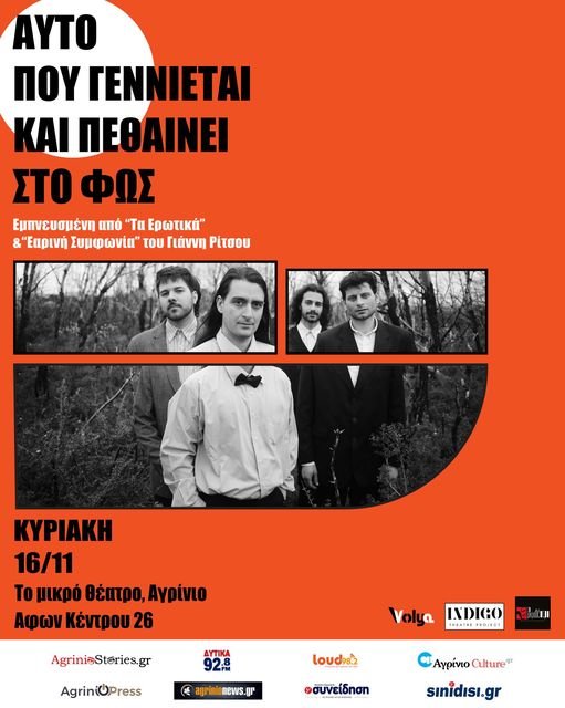 Στο Αγρίνιο, στο Μικρό Θέατρο της οδού Κέντρου 26, η θεατρική ομάδα Volya παρουσιάζει την παράσταση «Αυτό που γεννιέται και πεθαίνει στο φως», μια πρωτότυπη σκηνική σύνθεση βασισμένη σε δύο από τα πιο ερωτικά και υπαρξιακά έργα του Γιάννη Ρίτσου: την Εαρινή Συμφωνία και τα Ερωτικά.