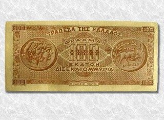 Το νόμισμα της δραχμής είχε απαξιωθεί καθώς είχε φτάσει στο έσχατο σημείο και στο πλαίσιο αυτό τυπώθηκαν τα χαρτονομίσματα «υποτιθέμενης» αξίας 100 δισεκατομμυρίων. Στην πορεία τυπώθηκαν και άλλα αντίστοιχα των 2 δισεκατομμυρίων, των 5, των 25 ακόμα και των 200. Στην πραγματικότητα, δεν σήμαινε ότι όποιος είχε ένα τέτοιο χαρτονόμισμα ήταν πάμπλουτος. Σε μια προσέγγιση με βάση τη χρυσή λίρα Αγγλίας σήμερα η πραγματική του αξία δεν θα ξεπερνούσε τα 10 λεπτά του ευρώ!