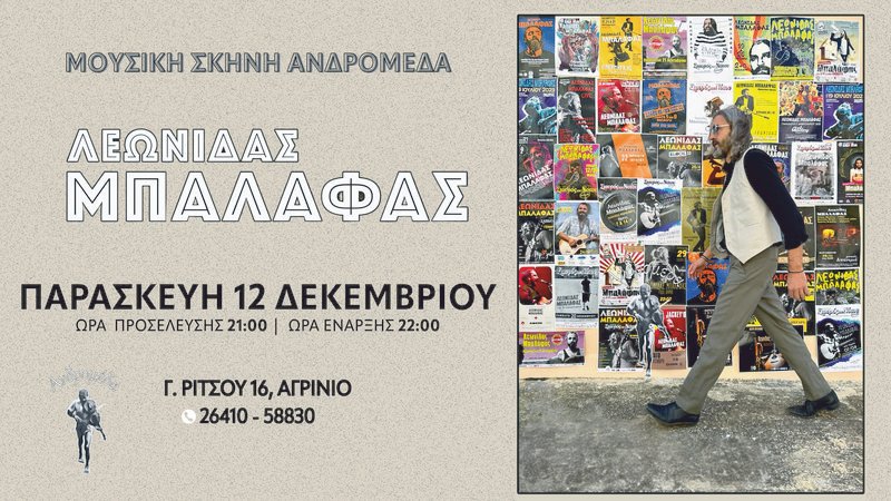Ο Λεωνίδας Μπαλάφας, ένας από τους πιο ιδιαίτερους και χαρισματικούς τραγουδοποιούς της γενιάς του, επιστρέφει στην Ανδρομέδα την Παρασκευή 12 Δεκεμβρίου για μια μοναδική βραδιά που αναμένεται να μείνει αξέχαστη!