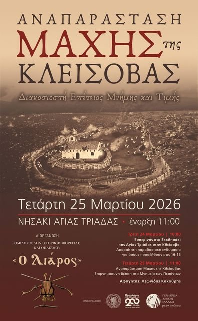 Την Τετάρτη 25 Μαρτίου 2026 στις 11:00 π.μ. στο νησάκι της Αγίας Τριάδας στην Κλείσοβα πρόκειται να πραγματοποιηθεί η αναπαράσταση της μάχης της Κλείσοβας, διακόσια χρόνια μετά το συγκλονιστικό εκείνο γεγονός που σημάδεψε την ιστορία της Επανάστασης και παραμένει έως σήμερα ένα από τα πιο δραματικά και ηρωικά επεισόδια της πολιορκίας του Μεσολογγίου, μια σύγκρουση που ακόμη και αν απομονωθεί από τα υπόλοιπα μεγάλα γεγονότα της ίδιας περιόδου εξακολουθεί να προκαλεί δέος για την ένταση και την αγριότητά της, καθώς η φθορά που υπέστησαν οι δυνάμεις των Τουρκοαιγυπτίων υπήρξε τέτοια που μπορεί να συγκριθεί μόνο με τη συντριβή της στρατιάς του Δράμαλη στα Δερβενάκια το καλοκαίρι του 1822 από τον Κολοκοτρώνη, ενώ η αριθμητική αναλογία δυνάμεων, που σύμφωνα με τους ιστορικούς έφτανε περίπου στο ένα προς είκοσι πέντε εις βάρος των Ελλήνων, καθιστά το αποτέλεσμα ακόμη πιο εντυπωσιακό και σχεδόν αδιανόητο, αφού μόλις εκατόν τριάντα περίπου υπερασπιστές κατάφεραν να αναχαιτίσουν και να κατατροπώσουν έναν συντριπτικά ανώτερο αντίπαλο, γεγονός που επιτρέπει να χαρακτηριστεί η μάχη αυτή ως ένα από τα ελάχιστα, αν όχι το μοναδικό, νικηφόρο περιστατικό τέτοιου μεγέθους στην πολεμική ιστορία υπό τόσο δυσμενείς όρους.