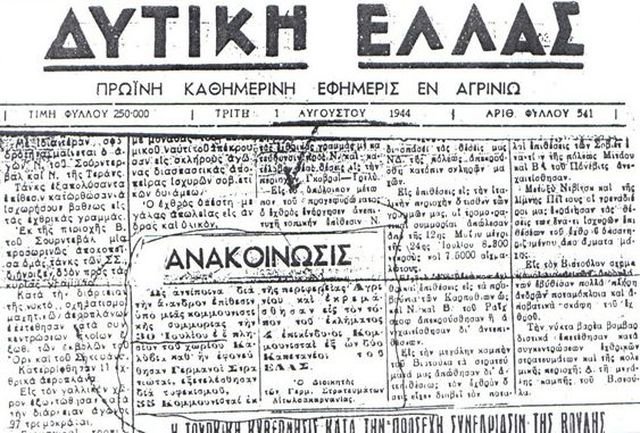 «Ως αντίποινα διά την άνανδρον επίθεσιν υπό μιας κομμουνιστικής συμμορίας την 30 Ιουλίου ε.ε. πλησίον του χωρίου Καλύβια, καθ’ ην εφονεύθησαν Γερμανοί Στρατιώται, εξετελέσθησαν διά τουφεκισμού 55 Κομμουνισταί εκ της περιφερείας Αγρινίου και εκρεμάσθησαν εις τον τόπον του εγκλήματος 4 επικίνδυνοι Κομμουνισταί, εξ ών δύο Καπεταναίοι του ΕΛΑΣ.