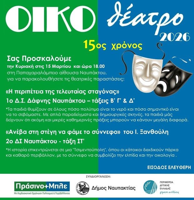 Το «ΟΙΚΟθέατρο» της Ναυπάκτου, το οποίο συμπληρώνει φέτος δεκαπέντε χρόνια δημιουργικής παρουσίας στην τοπική πολιτιστική ζωή, καλεί το κοινό στην ολοκλήρωση των θεατρικών του δράσεων για το 2026, μέσα από μια εκδήλωση που θα πραγματοποιηθεί την Κυριακή 15 Μαρτίου στην Παπαχαραλάμπειο αίθουσα της πόλης, όπου μαθητές δημοτικών σχολείων παρουσιάζουν δύο παραστάσεις με έντονο περιβαλλοντικό μήνυμα, καθώς μέσα από τη σκηνική τους παρουσία επιχειρούν να θυμίσουν σε μικρούς και μεγάλους ότι το φυσικό περιβάλλον, το νερό και ο δημόσιος χώρος αποτελούν πολύτιμα αγαθά τα οποία απαιτούν σεβασμό και προστασία.